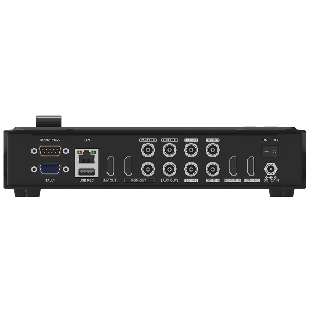 - Ausgänge: 2× SDI, 1× HDMI PGM, 2× SDI AUX, 1× HDMI Multiview, 1× USB Typ-C
