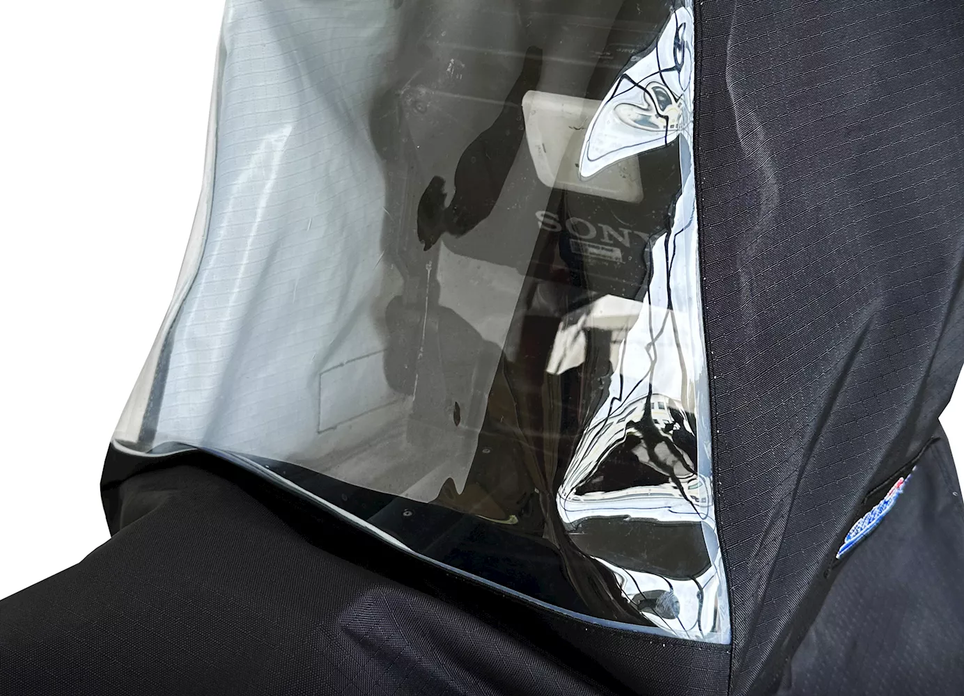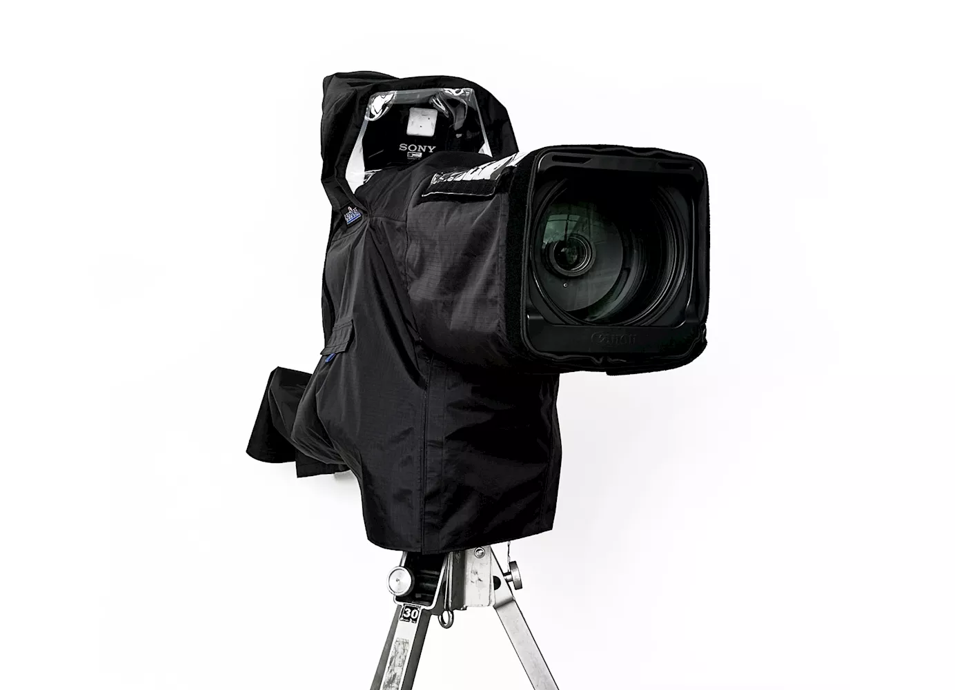 Universal protection for a wide range of outside broadcasting cameras using a large lens adaptor, viewfinder, and viewfinder sun hood. Includes a water-resistant storage pouch.