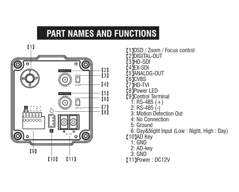 - 1x SDI Signal (BNC),1x HD/SD Analog Signal (BNC),12VDC-Spannungseingang,RS-485,Externe Tag/Nachtumschaltung,Alarmausgang