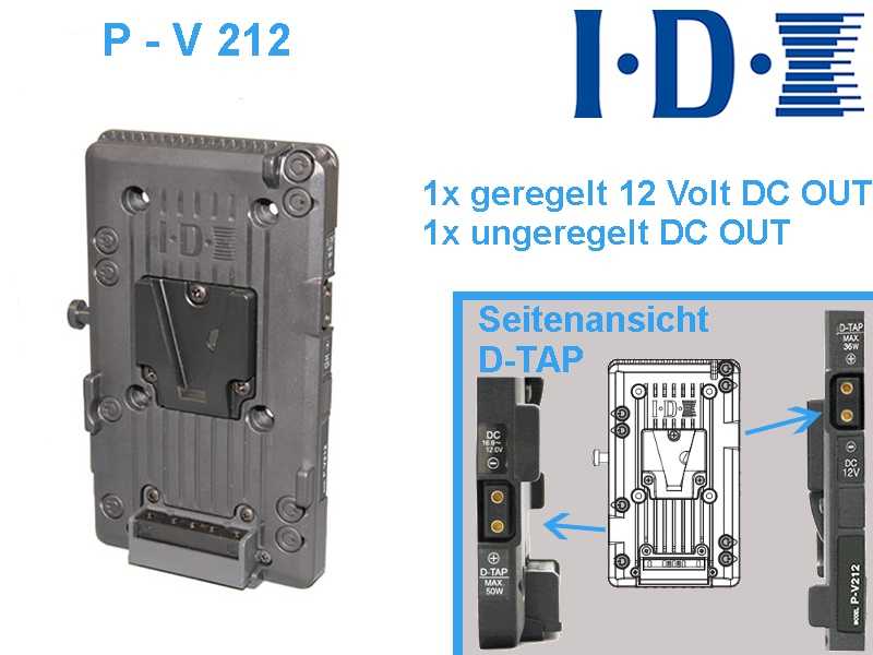 An der IDX P-V212 Platte sind seitlich zur zusätzlich Stromversorgung externer Geräte aus den Kamera Akku ein geregelter 12V DC-Ausgang (max. 35 Watt) + ein ungeregelter DC-Ausgang (max. 50 Watt) über eine 2 poligen D-Tap Buchse angebracht.