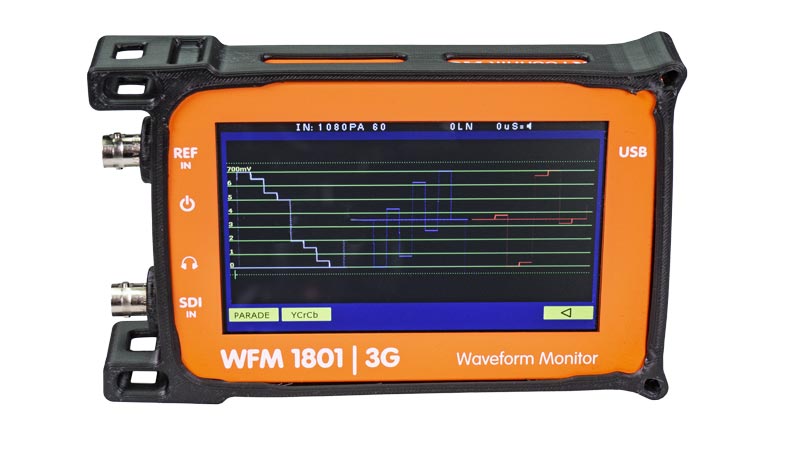 Protective case (or bumper) for the WFM 1801. This is designed to provide some protection against accidental damage. The BNC connectors are now protected from damage and the case also affords some protection from the screen cracking due to shock when dropped on a hard surface. This option is highly recommended for the portable Waveform Monitor