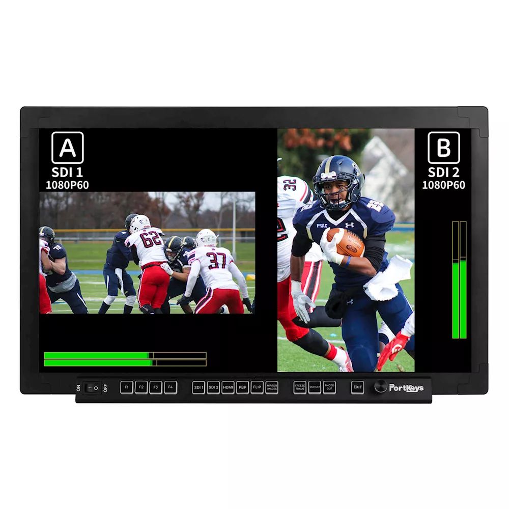 is a 21.5-inch professional high-brightness production monitor with 1,200nits of brightness, a rugged aluminum alloy construction, two 3G-SDI, one GPI, and one HDMI input ports, one 3G-SDI and one HDMI output ports with cross-conversion, two XLR audio outputs with 48V phantom power, and a complete set of precise monitoring tools.