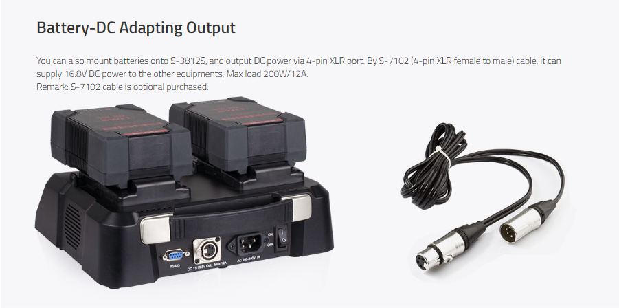 (Hinweis: Der Ladebetrieb und DC-OUT sind nicht für einen gleichzeitigen Betrieb vorgesehen) - Eingesetzter Akku (1 oder 2) kann auch als Stromversorgung für den 4-pol. XLR OUT bis 200 Wh verwendet werden (ähnlich einer USV)