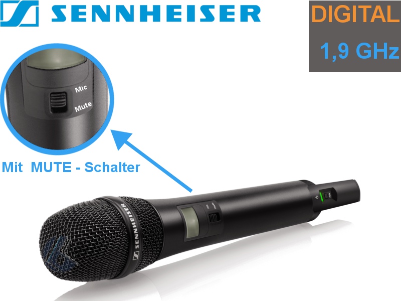 Handsender und MMD 835 Mikrofonkapsel (Niere) und MUTE-Schalter unter dem Display.