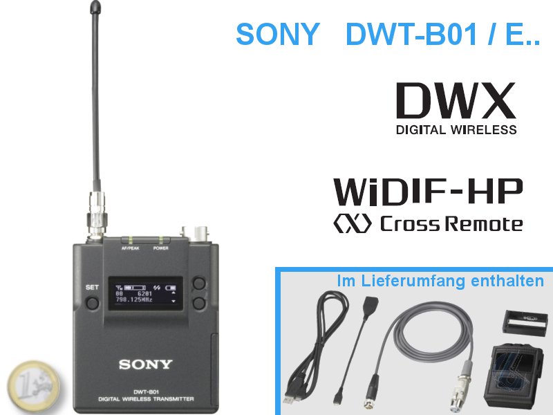 Der DWT-B01 ist ein digitaler wireless Taschensender und funktioniert als Bestandteil der Sony DWX Digital Wireless Serie problemlos mit allen DWX Transmittern (z.B. DWM02) und Receivern (z.B. DWR-R02D, DWR-S02D) im gleichen Frequenzbereich.