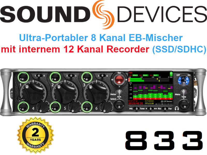 Sound Devices SD 833 - 8 Kanal EB Mischer TimeCode 12 Spur Recorder auf int SSD oder ext SD