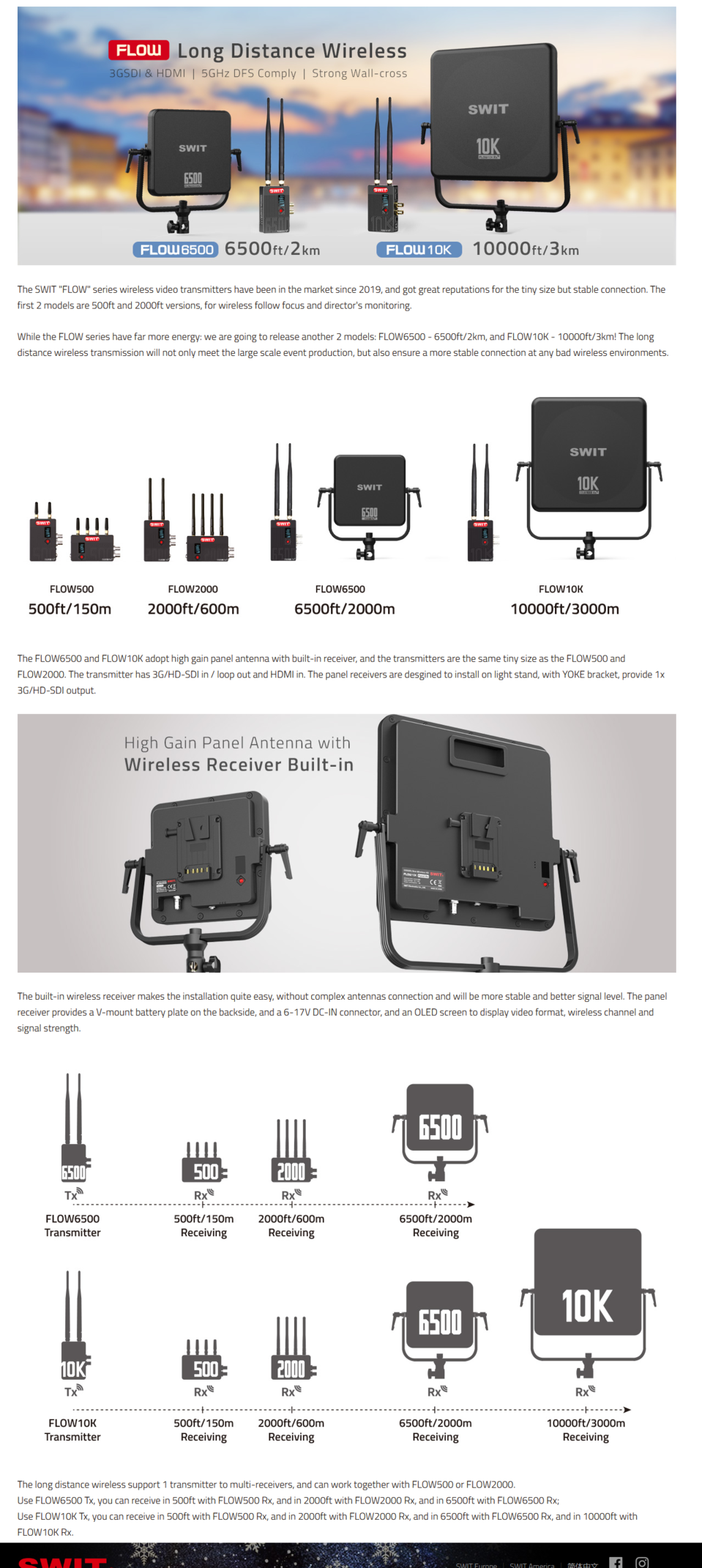 FLOW6500 wireless system is based on SWIT latest professional KUWI wireless technology, 5.1-5.9GHz license free bands, DFS comply, sup- ports 3G/HD-SDI and HDMI (Max 1080p60) to transmit 6500ft / 2km Line-of-Sight distance. The KUWI professional wireless chip features stable connection at any complex environment and stronger in wall-cross capability.