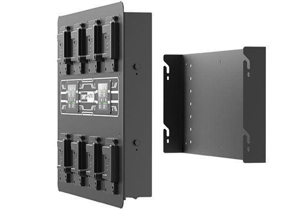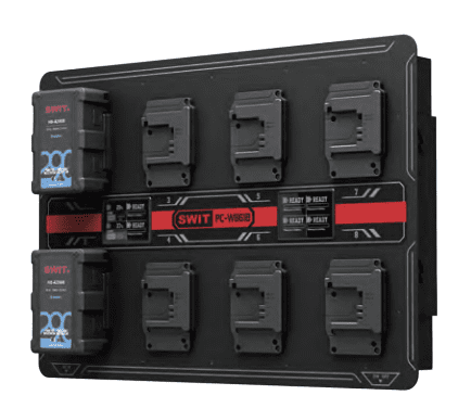 Swit Matrix-B8 8-ch simultaneous B-mount fast charging DC33.6V, 3A, 100W for ≥160Wh batteries DC33.6V, 1.3A, 44W for <160Wh batteries 2× 3.5-inch color LCD info display Battery cycle times display Large LED charging indicators Wall mounting or 19-inch rack install