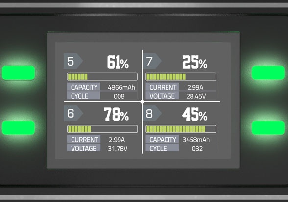 3.5-inch Color LCD and Indicators MATRIX-B8 provides 2x 3.5-inch color LCD to display charging progress, charging current, voltage, battery cycle times for each channel.You can also check the charging status by large charging indicators from a distance.