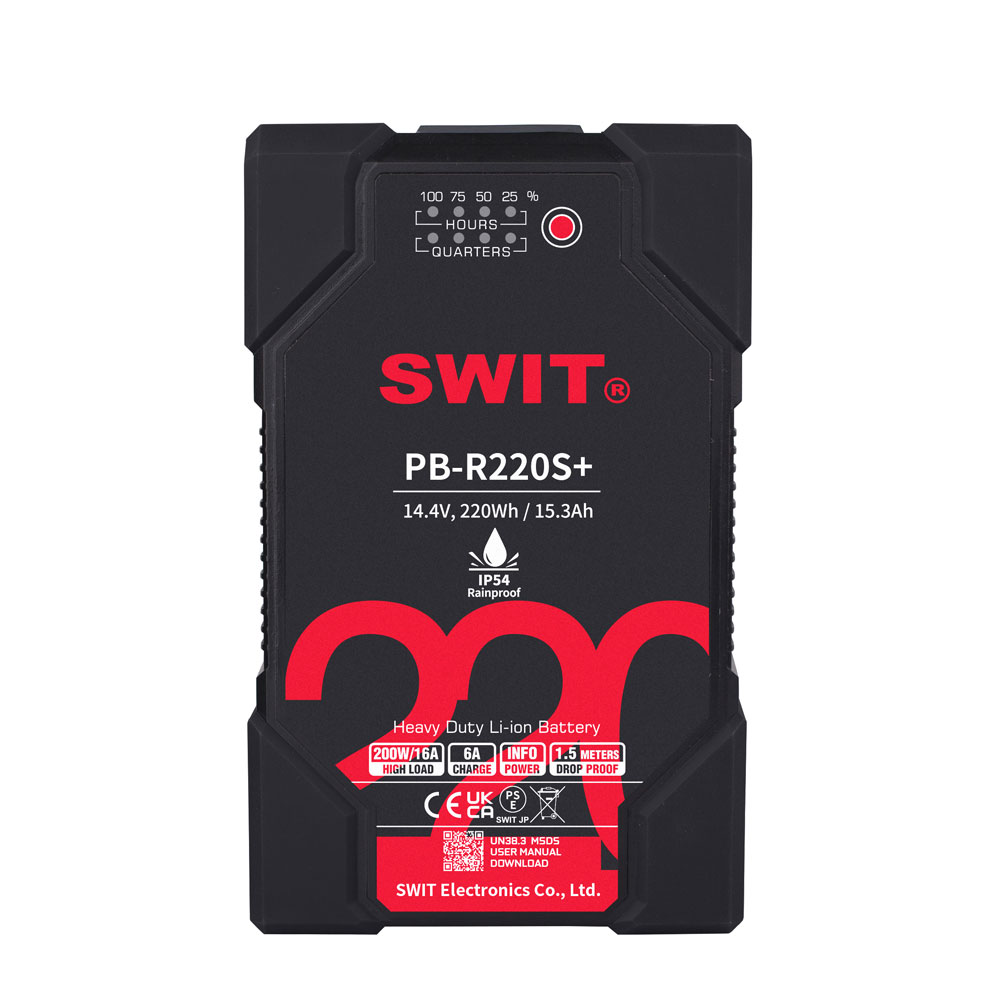 Startseite » AKKU & LADER » Akku V-Mount » Über 161 Wh » Swit PB-R220S+ l 220Wh Waterproof IP54 Robust Heavy-duty Battery, V-Mount, also ideal for long term use or high power draw lights