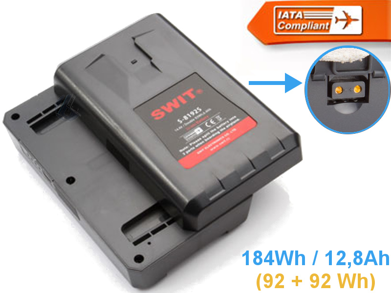 Teilbarer SWIT V-Mount Lithium-Ionen Akku mit noch höherer Kapazität - 184 Wh (2x 92 Wh) und D-TAP Ausgang (bis 100 Watt / 8Ah).